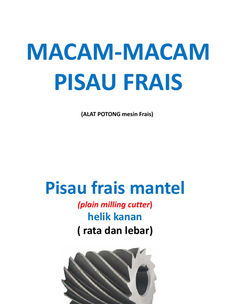 Dan pahat yang digunakan baik itu mesin frais vertikal maupun horisontal banyak sekali jenis dan bentuknya. Alat potong yang digunakan pada mesin frais,atau yg biasa disebut dengan pisau frais (milling cutter) adalah peralatan yang digunakan untuk menyayat benda kerja atau pun membuat alur dan profil pada benda kerja. Jenis pisau ini juga dikenal dengan nama pisau modul. Pemilihan pisau frais berdasarkan pada bentuk benda kerja, serta mudah atau kompleksnya benda kerja yang akan dibuat. Pisau frais j ari (endmill cutter) pisau frais jari yang biasanya digunakan untuk membuat alur tembus atau bertingkat dan mengefrais rata untuk bidang yang lebarnya relatif kecil. Ada beberapa jenis arbor yang sering dipakai pada mesin frais, seperti arbor panjang, arbor pendek dan arbor dengan ujung tap. Tidak seperti mata pahat pada mesin bubut atau mesin sekrap yang memiliki satu mata pemotong, pisau frais pada umumnya memiliki beberapa mata pemotong banyak dan jamak. 20 jenis pisau frais dan fungsinya 1. Beragamnya jenis dan bentuk serta standar alat potong cutting tool. Bentuk standar beberapa pisau frais digunakan dalam industri saat ini, yang dijelaskan lebih rinci di bawah. Mesin ini mempunyai prinsip kerja yaitu pisau pemotong yang diputar oleh spindel. Pisau frais jenis ini digunakan pada mesin frais horizontal (perhatikan pada gambar c) pemotong gigi berbentuk spiral/involute gear cutter. Bentuk standar beberapa pisau frais dipakai dalam industri ketika ini, yang dijelaskan lebih rinci di bawah.